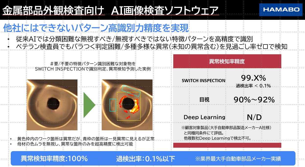 少量の正常画像を学習して検査ができ、ノイズを除去しながら特徴を自ら高精度で取得する独自のAIアルゴリズムにより、これまで判定困難であったキズ、打痕、変形、欠品などの検出・可視化が可能です。