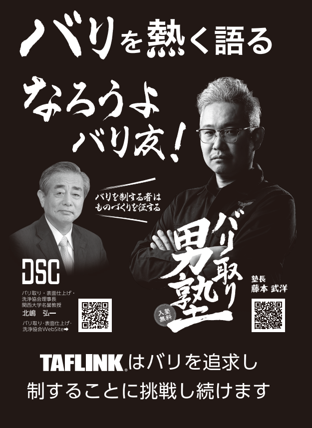 浜松の中小企業3社連携でバリ取り問題解決チーム『TAFLINK』を結成しております。今回3社並んで出展しておりますので、どのようなチームなのかお越し頂けると幸いです。