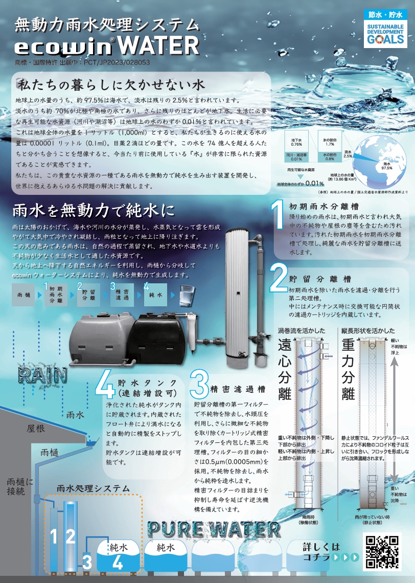 昨今では、LPガス業者の特性を生かして防災商材や防災イベントへも積極的に参加しております。今回、創業52年で培ってきた自社工事体制の技術と知識を生かして新事業として~日常使用から災害用水まで。~のecowinウォーター”無動力雨水純粋化システム”の販売及び施工。そして省エネ事業としてエアコン室外機に特化した遮熱塗料の販売及び施工。これらの事業に取り組む事に致しました。
