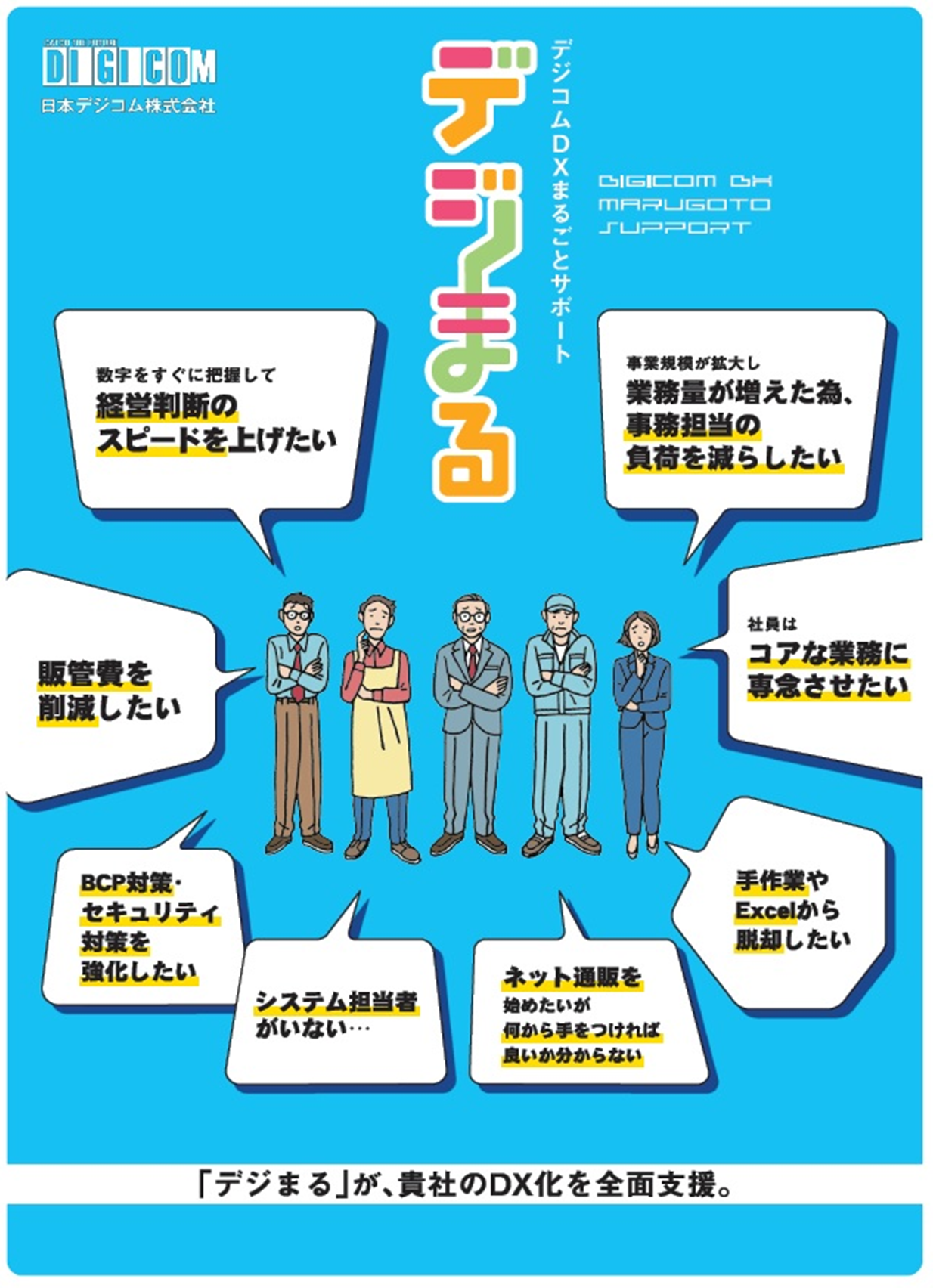 | 主力製品・商品 (製品名・商品名) | ●デジまる まるっとITサポート まるっとセキュリティサポート DX導入支援サービス ●システム/ソフトウェア らくらく販売管理 生産管理システム 家具販売管理システム デジコムクラウドサービス patomサイネージ patom検針アプリ ●システム開発 受託開発 技術者支援 https://www.digicomnet.co.jp/ |