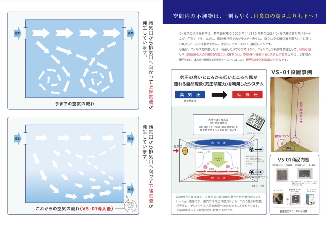 「VS-01」はフィルターを通過させたり薬品等で殺菌、滅菌することなく「気圧傾度力」を用いていち早く野外に汚れた空気を「排気」する特許を取得した画期的なシステムです。