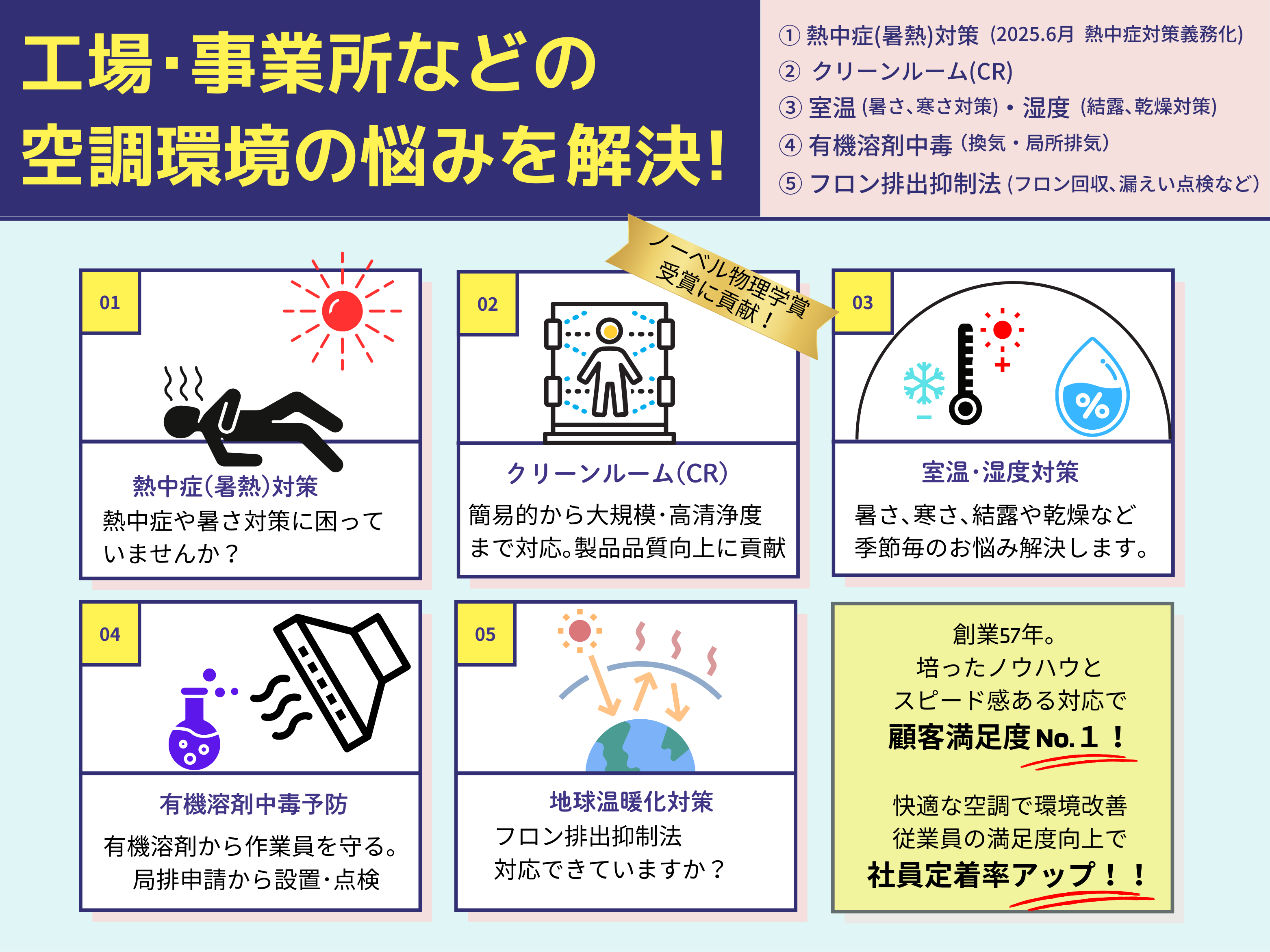 キャッチコピー空調環境のお悩み解決します! 工場・事業所に特化した空調設備の専門会社です。
