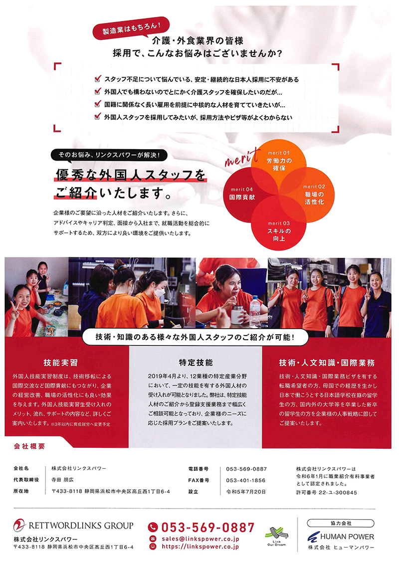 | 製品・商品特徴 | 「外国人人材紹介」 ・関連企業と連携し国内外の対応可能。 ・なんでも気軽に相談できる。 「女性活躍推進」 ・グループ会社㈱リトワードリンクスにて実践中。 ・富士市でセミナー登壇の実績あり。 |