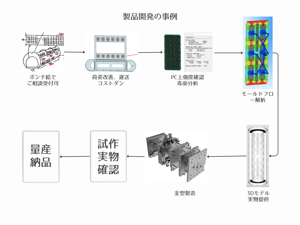金型製作では、試作実物を30万円から提供可能で、設計・デザイン、図面作成、3Dプリントモデル、試作、量産、アプリ開発、特許取得まで、製品開発の全工程をトータルサポートいたします。金型設計段階でのコスト意識と金型流れ解析により、成形後も生産条件を満たす高品質な金型を提供します。