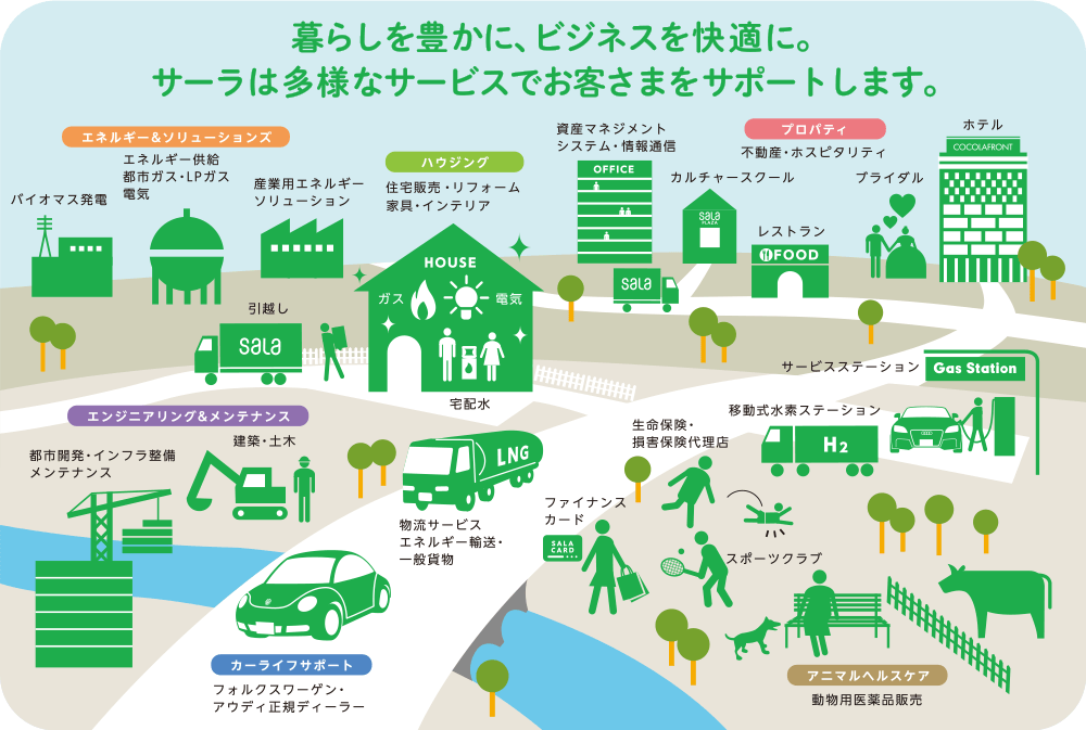 | 主力製品・商品 (製品名・商品名) | ・電気、都市ガス、プロパンガスなどを供給するエネルギー事業 ・土木工事、管工事、機械設備などの導入、維持管理を行うエンジニアリング・メンテンナンス事業 ・不動産やホテル、レストランの運営などの事業 ・注文住宅の施工、建売住宅の販売、リフォーム、リノベーション事業 ・動物の薬品を扱うアニマルヘルスケア事業 ・アウディ・フォルクスワーゲンなど輸入車販売を行うカーライフサポート事業 ・各種保険の取り扱いや宅配水事業など |