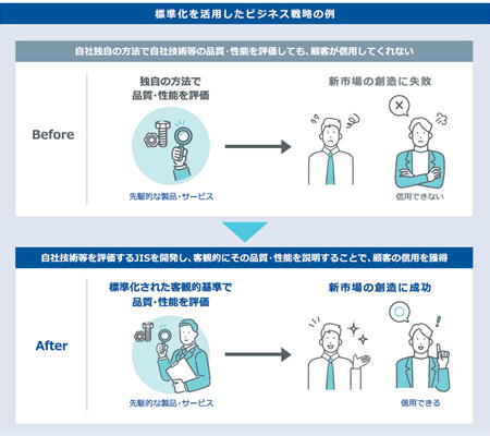 例えば、自社の製品・サービスの質の高さを適切に評価できる試験方法をJISとして標準化することができれば、業界全体で同じJIS(モノサシ)で、その製品等の質を評価できるようになるため、自社の優位性をアピールしやすくなります。