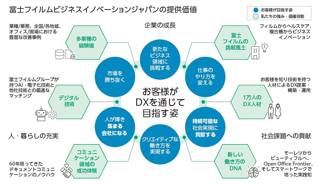 | 製品・商品特徴 | 富士フイルムビジネスイノベーションは創業以来培ってきた「紙に情報を複写する」というビジネスからの事業構造転換を進めています。働き方革新やデジタルトランスフォーメーションを支援する商品やサービスの提供を通じ、お客様の経営課題の解決に貢献します。